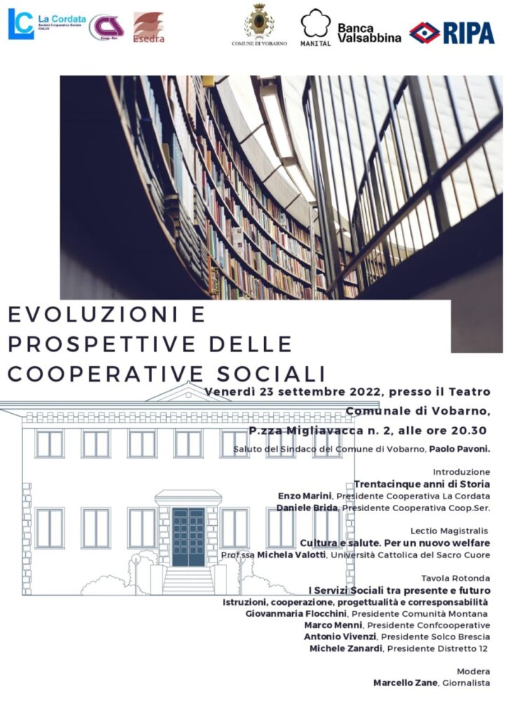 EVOLUZIONI E PROSPETTIVE DELLE COOPERATIVE SOCIALI Agnese Provasi 14 Settembre 2022 Soci 0 commenti La Cooperativa sociale La Cordata di Roè Volciano festeggia i 35 anni di vita. Una ricorrenza e molte iniziative per ricordarla.Il 23 settembre si svolgerà nel teatro comunale di Vobarno il un convegno per raccontare storia e futuro della coop.Di seguito il programma dell’evento: Condividi Facebook Twitter Pinterest Navigazione articoli News precedenteUNA RISPOSTA ALLA DEMENZA | Nuovi Percorsi TerritorialiProssima newsOGNI UOMO SEMPLICE Lascia un commento Annulla risposta Nome Your Email Salva il mio nome, email e sito web in questo browser per la prossima volta che commento. Il tuo commento Altre news Ultime notizie da Solco 29 Agosto 2025 Soci 0 commenti Educatorə prossimə. Il lavoro educativo raccontato per immagini La Cooperativa sociale La Vela presenta Educatorə prossimə, una mostra fotografica che esplora ... Leggi di più 3 Novembre 2024 Eventi 0 commenti CONVEGNO “DENTRO IL CAMBIAMENTO” Convegno “Dentro il Cambiamento” fra continuità e innovazione per i diritti delle persone ... Leggi di più 31 Ottobre 2024 Eventi 0 commenti “DIALOGHI CON MIGUEL BENASAYAG” “Dialoghi con Miguel Benasayag”: un evento per riflettere sulla comunità Il 25 novembre ... Leggi di più
