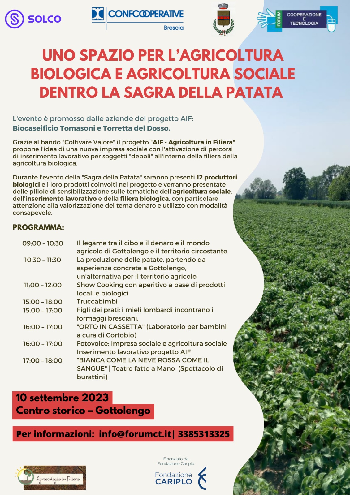 Durante l’evento Solco sarà presente insieme a 12 produttori biologici coinvolti nel progetto “AIF Agricoltura in Filiera” a presentare i prodotti locali e delle pillole di sensibilizzazione sulle tematiche dell’agricoltura sociale, dell’inserimento lavorativo e della filiera biologica.